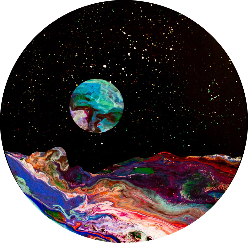 I began with a flower pot acrylic pouring experiment. I liked the painting but did not love it. This made it the perfect recruit for this spray paint technique. Planned out and masked my favorite sections of the painting and went to space.